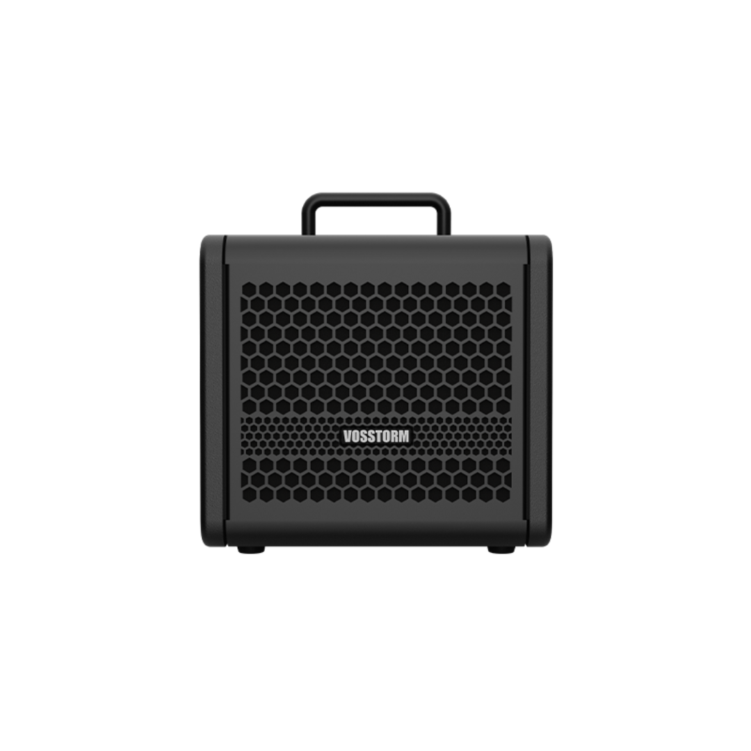 O gabinete acústico bass reflex é construído com MDF e acabamento em poliéster. Na parte frontal, uma tela em aço com furos sextavados e pintura eletrostática texturizada confere beleza e proteção para o alto-falante