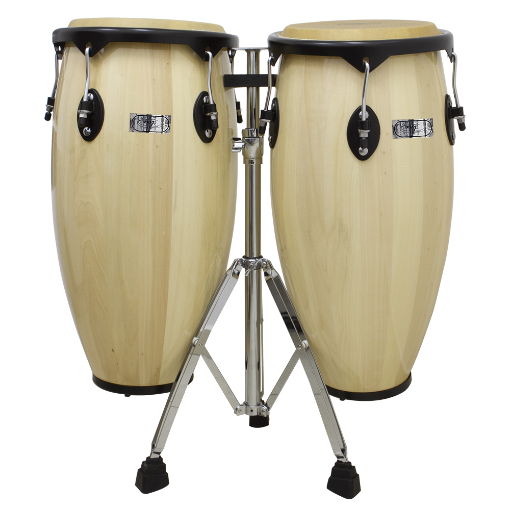 Par de Congas New York, no tamanho 11 e 12” produzida em madeira com pele de búfalo acompanha suporte com acabamento cromado.